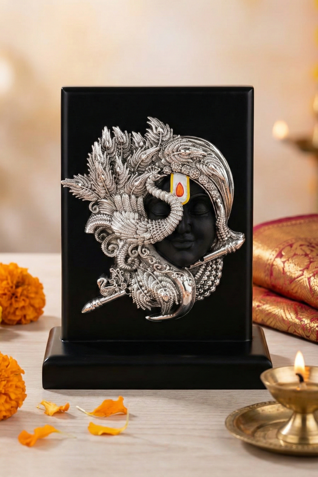 999 Silver Plated Shringar Krishna Face Idol on Premium MDF Base