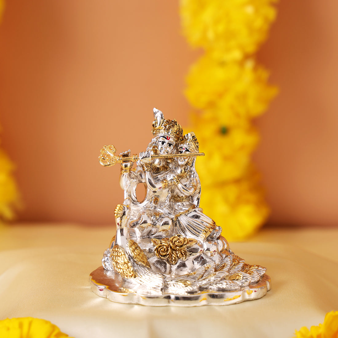 Radha Krishna Murti with Peacock - Gold and Silver Plated
