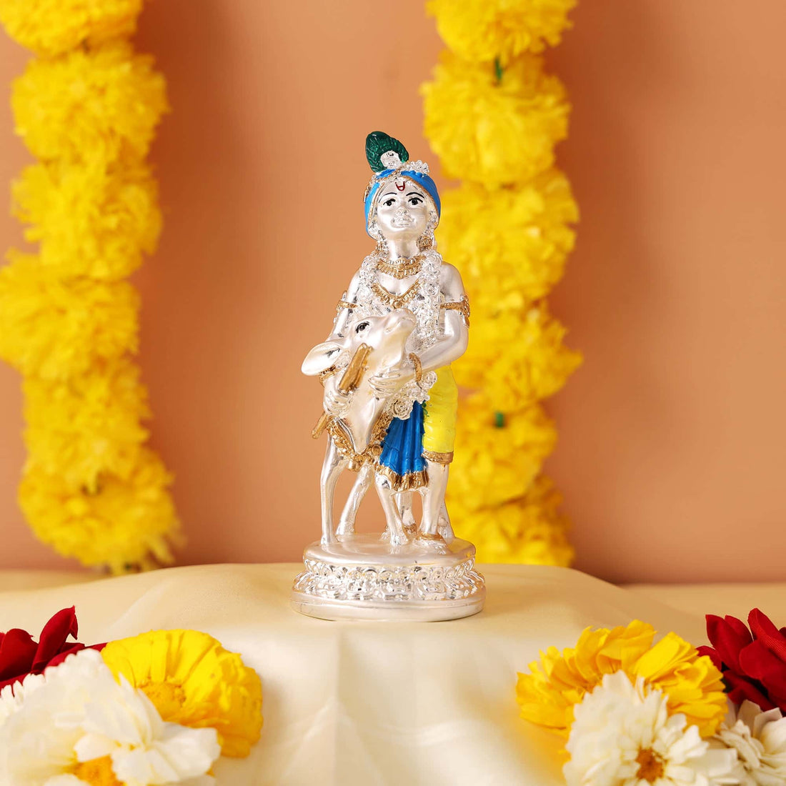 Silver Plated Krishna and Cow Idol with Elegant Matt Finish