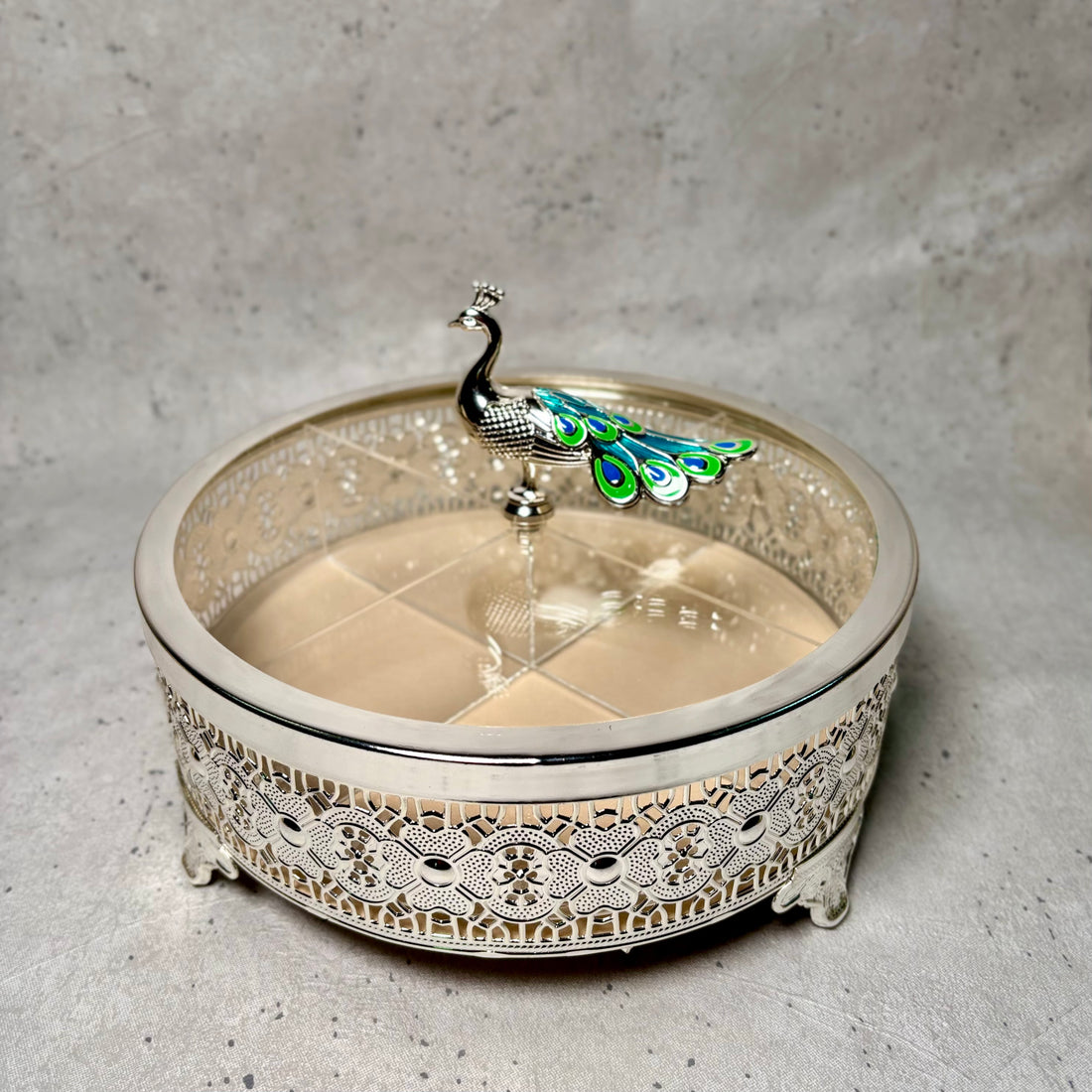 Peacock Dryfruit Box – 4 Compartment Silver Gift Box