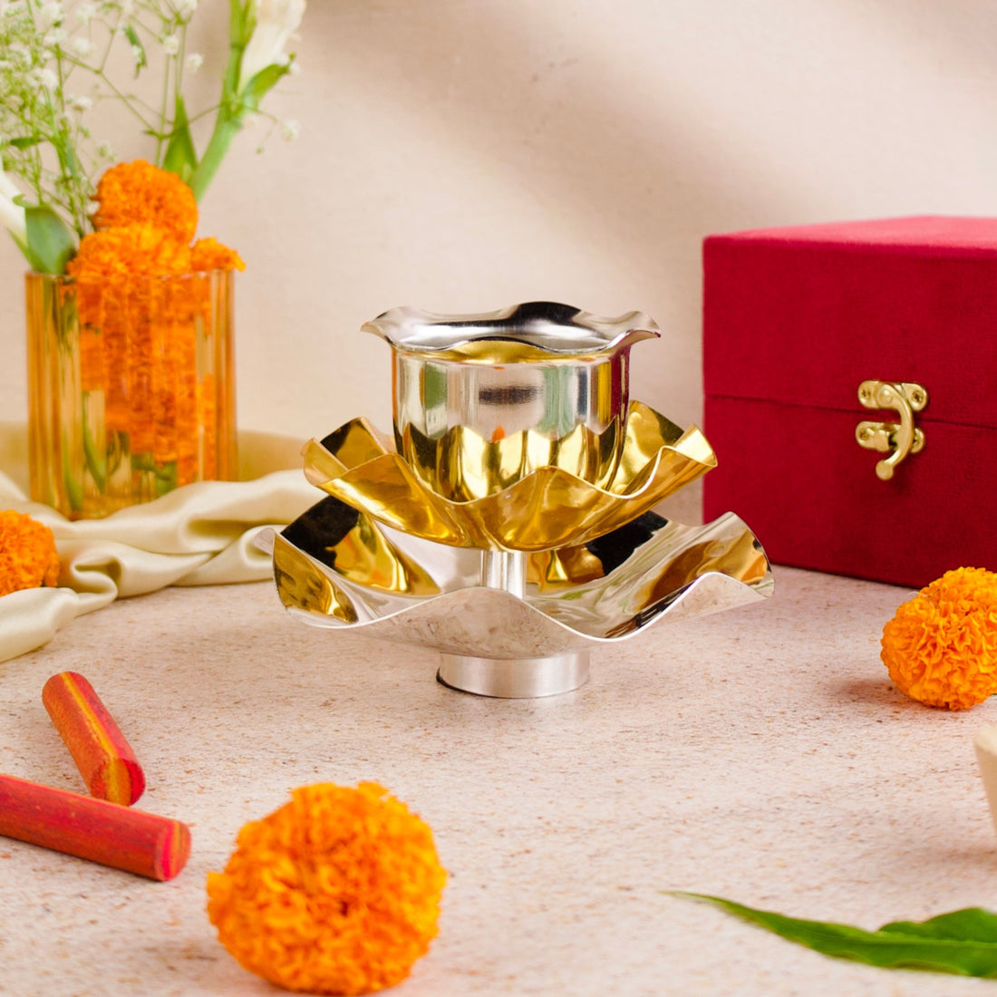 Divine Lotus Diya – Layered Brass Lamp in Gold & Silver Finish
