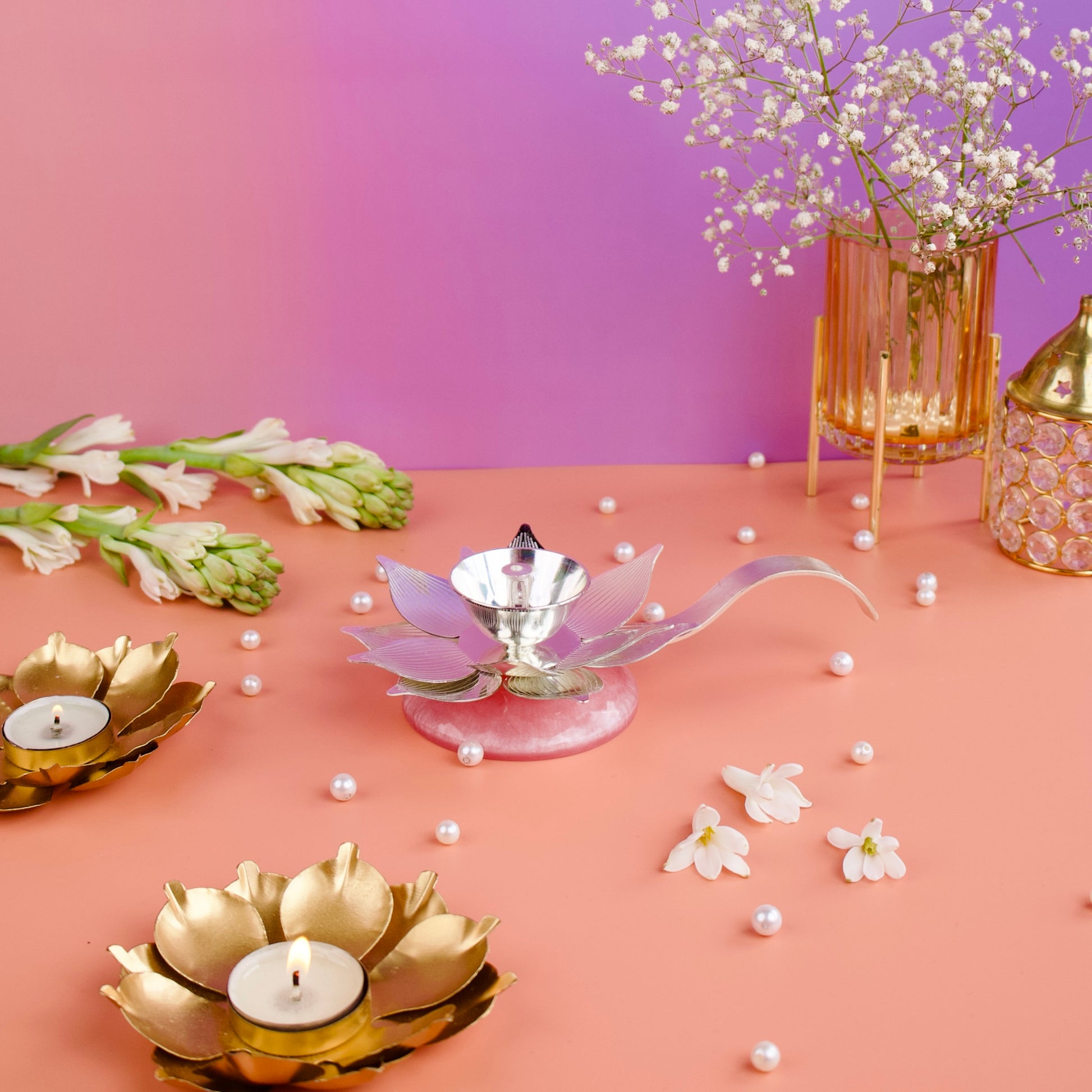 Brass Pink Enamel Silver Plated Diya & Bell Set – Elegant Festive Gift for Puja & Home