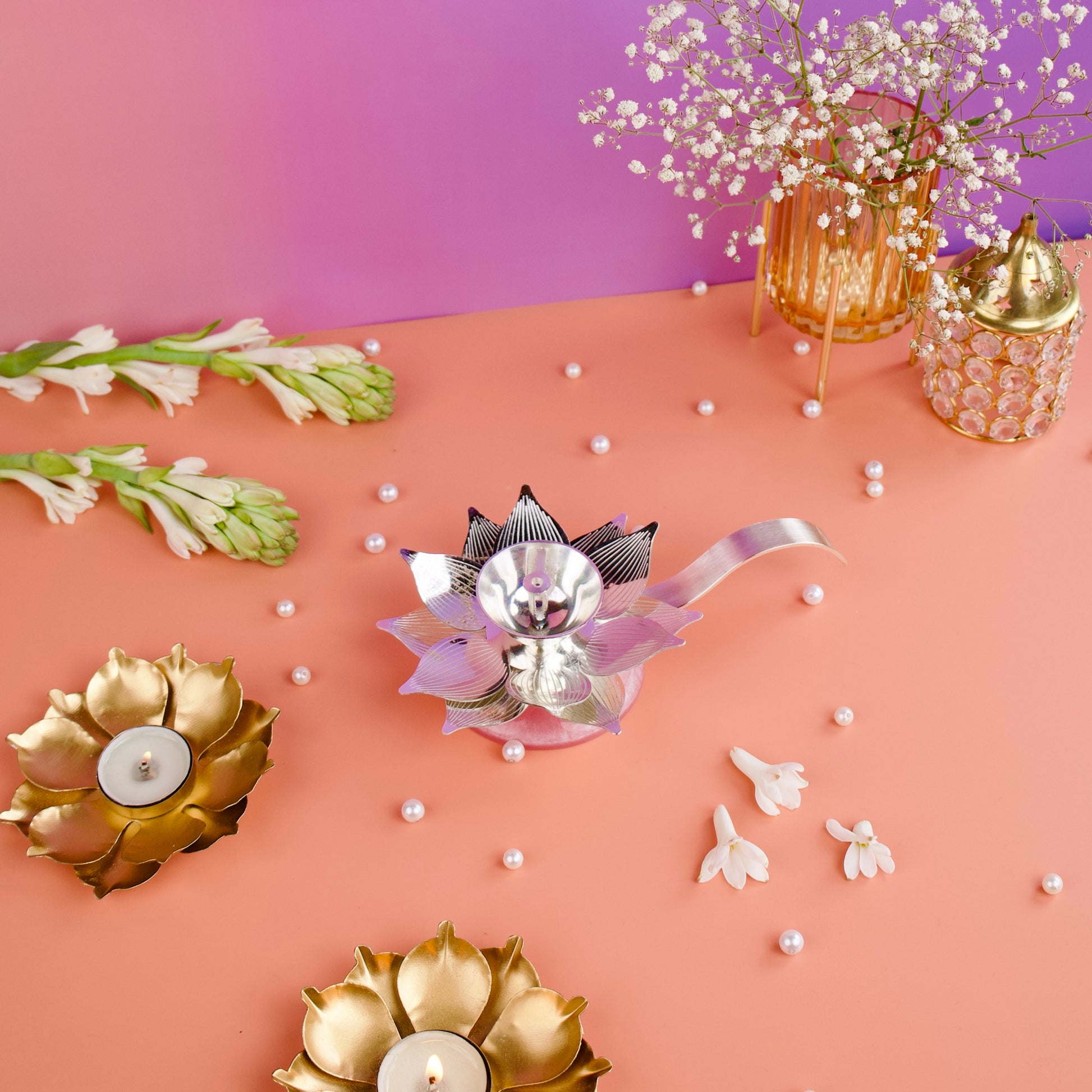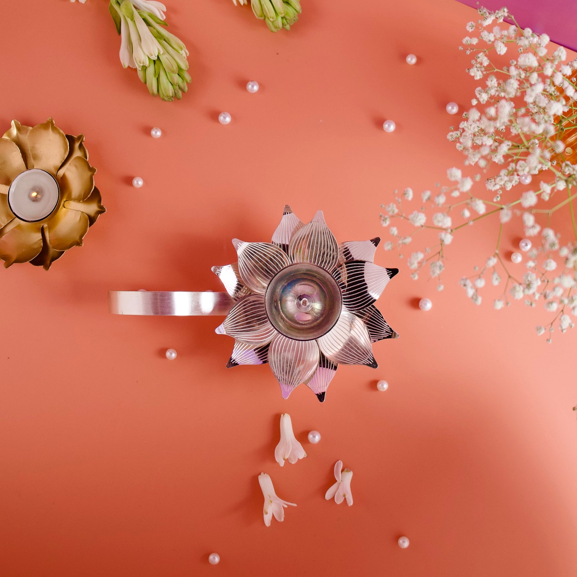 Make every prayer more graceful and every gift unforgettable with our Brass Pink Enamel Silver Plated Diya & Bell Set. Beautifully handcrafted in brass, finished in pure silver plating, and highlighted with soft pink enamel—this set brings divine charm and premium artistry into one unforgettable offering.