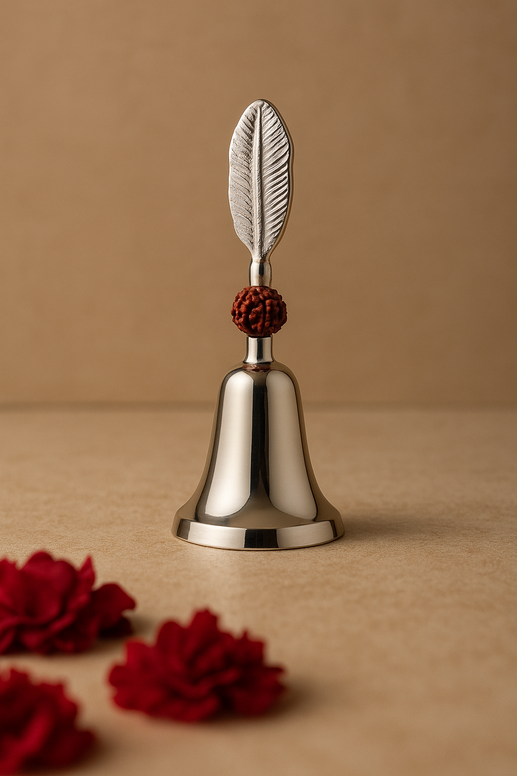 Brass Rudraksh Bell with Silver Plating – Divine Pooja Ghanti for Temple & Home Mandir - 6 inches