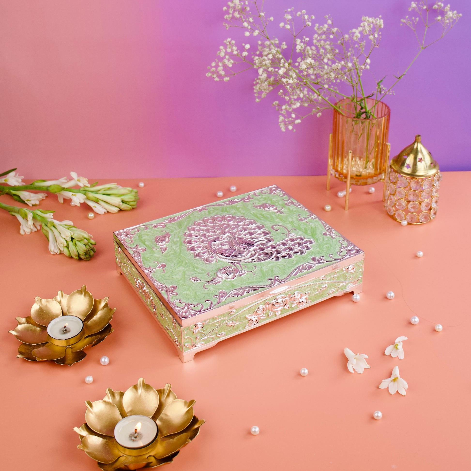 Bring home elegance wrapped in tradition with our Peacock Enamel Dry Fruit Box—a masterpiece of functionality and festive charm. Designed with 4 neatly divided compartments and adorned with intricate peacock enamel art, this box is perfect for storing dry fruits, sweets, or even precious knick-knacks in regal style.
