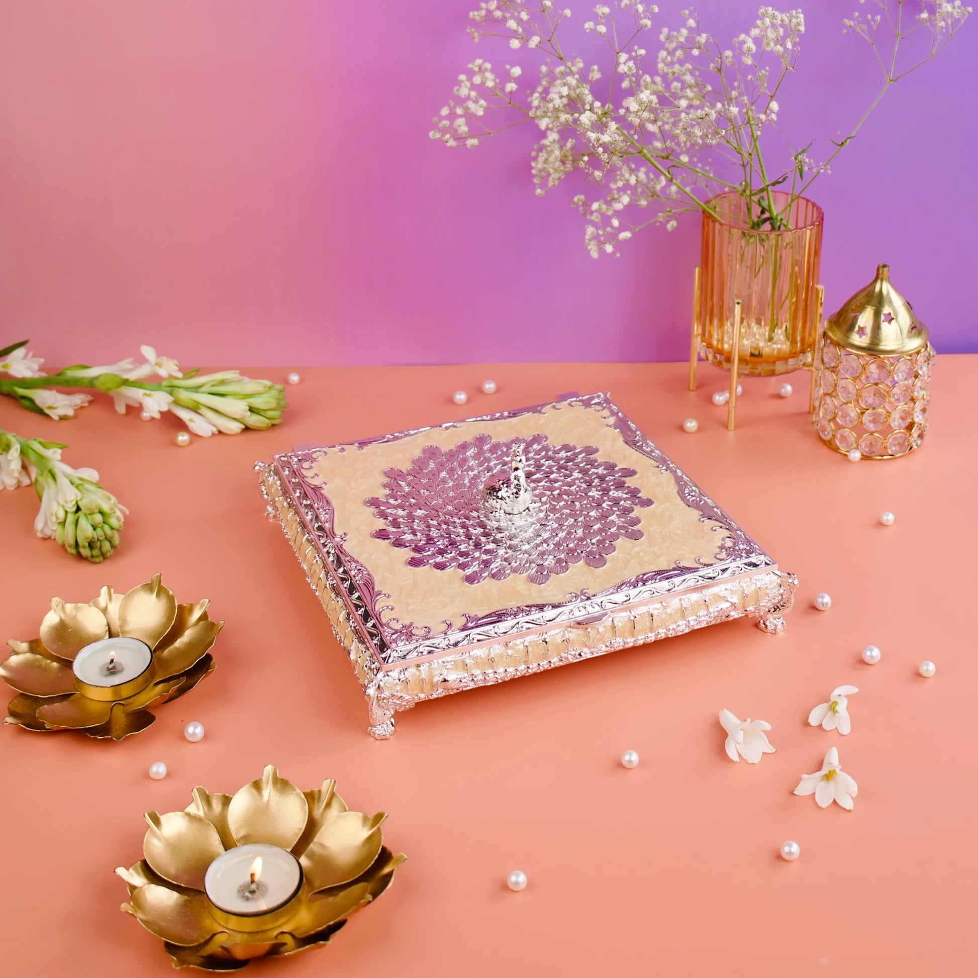 Perfect for mukhwas, dry fruits, or mouth fresheners, the silver enamel box elevates everyday indulgence into a high-value gifting experience, while the velvet box ensures a striking, ready-to-gift presentation.